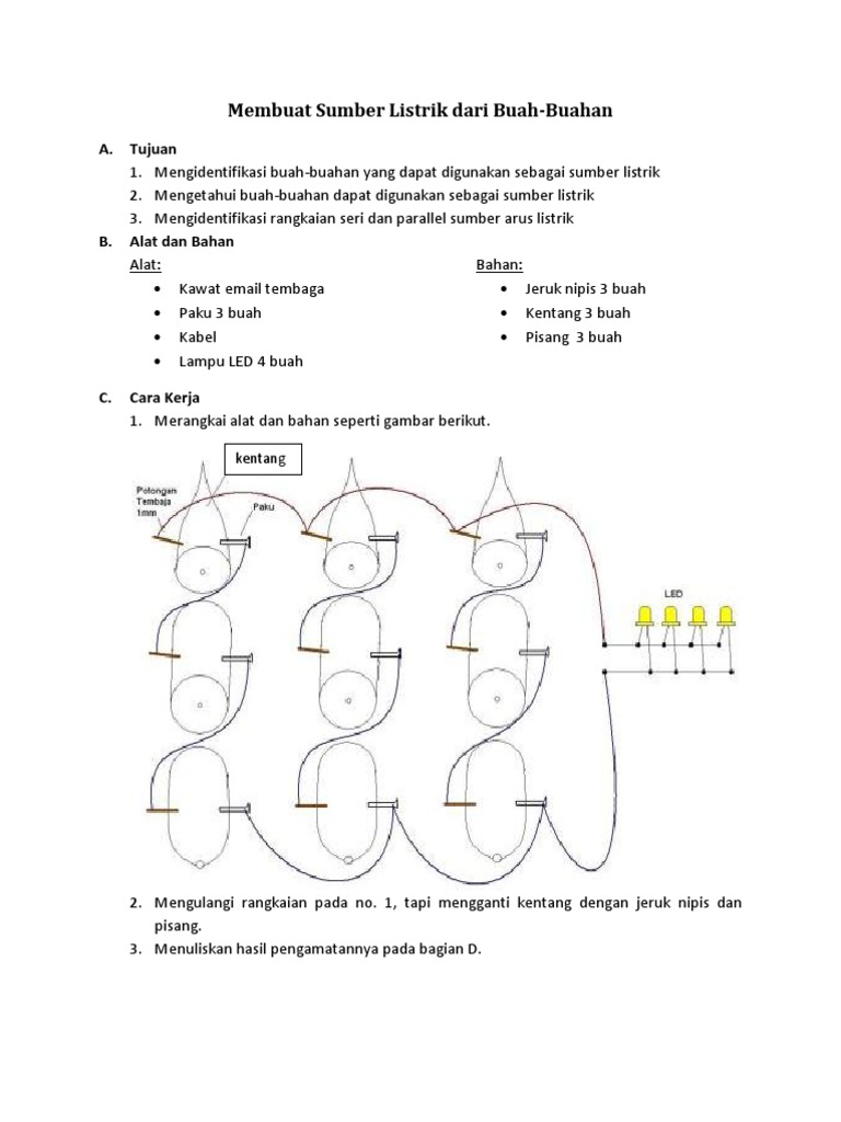 Laporan Percobaan Kandungan Listrik Pada Buah / Laporan Percobaan Kandungan Listrik Pada Buah Goreng : Kandungan vitamin c pada buah juga merupakan parameter untuk menentukan kualitas buah.. Pada percobaan menghubungkan antara satu, dua, tiga buah kentang dengan kabel yang telah dipasang lampu led, yang terjadi lampu tidak pada saat menghubungkan lampu dengan lima buah kentang ternyata lampu menyala terang. Pada buah tertentu terdapat indeks pematangan buah yang menghubungkan antara kandungan gula dan kandungan asam. Teks laporan percobaan adalah teks berisi proses dan hasil percobaan. Andi asy syahidatul farha azizah. Sedangkan percobaan ialah suatu bentuk kegiatan penelitian untuk menguji.