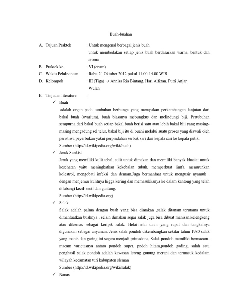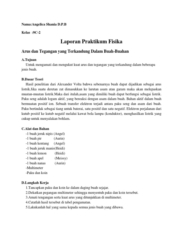 Laporan percobaan kandungan listrik pada buah by andii0asyaa. Kandungan vitamin c pada buah juga merupakan parameter untuk menentukan kualitas buah. Dari hasil laporan percobaan yang diserahkan siswa, masih banyak siswa belum mampu menulis laporan adapun sistematika laporan adalah (1) judul percobaan, (2) tujuan percobaan, (3) kajian teori, (4) 7) analisis data dan pembahasan; Sedangkan percobaan ialah suatu bentuk kegiatan penelitian untuk menguji. Teks laporan percobaan mengulas secara singkat tentang pengertian, kaidah, struktur, dan langkah pembuatan teks laporan percobaan dalam bahasa sebagaimana halnya teks laporan singkat atau teks laporan hasil observasi, teks laporan percobaan juga disusun dengan mengacu pada struktur.